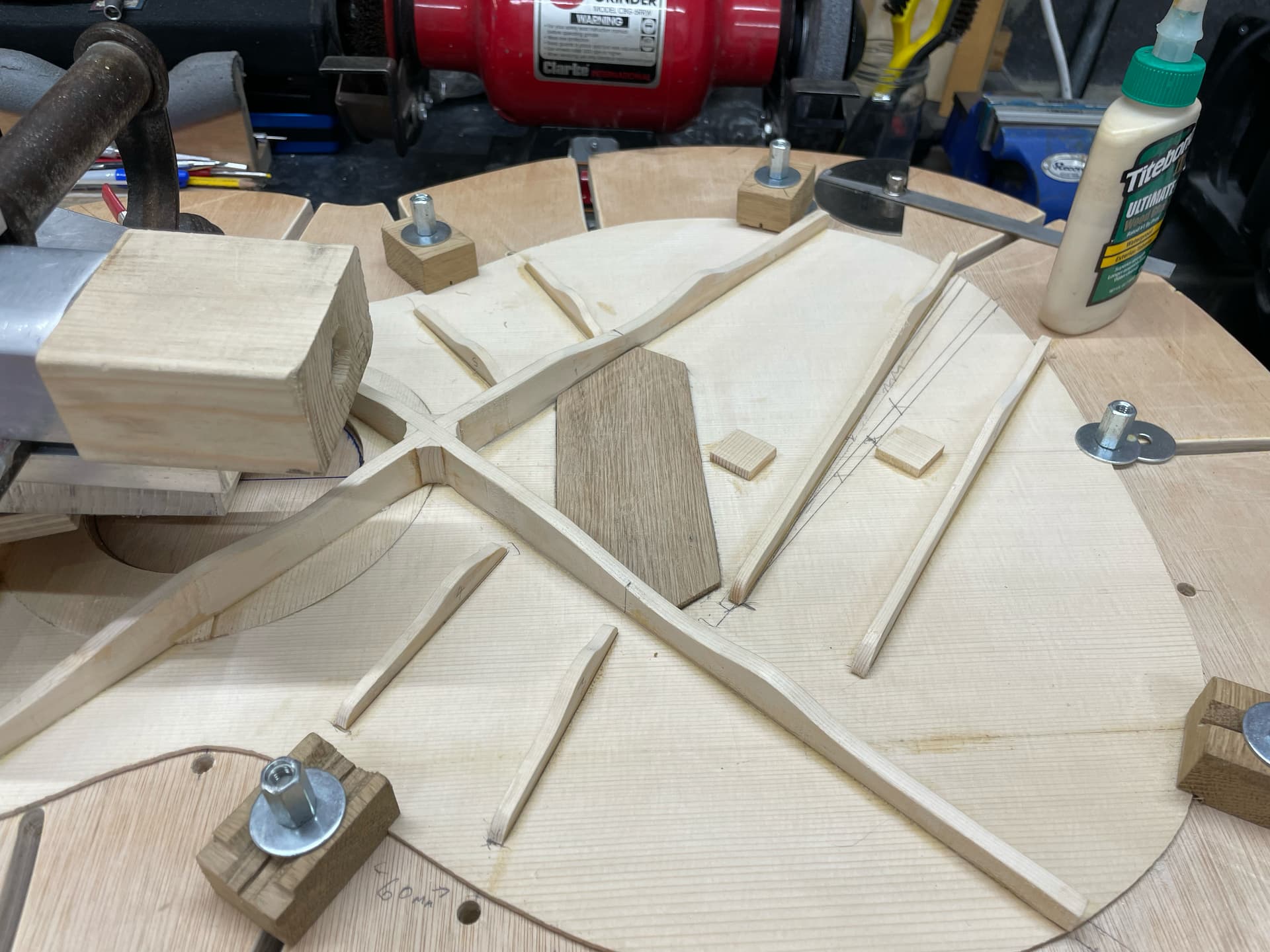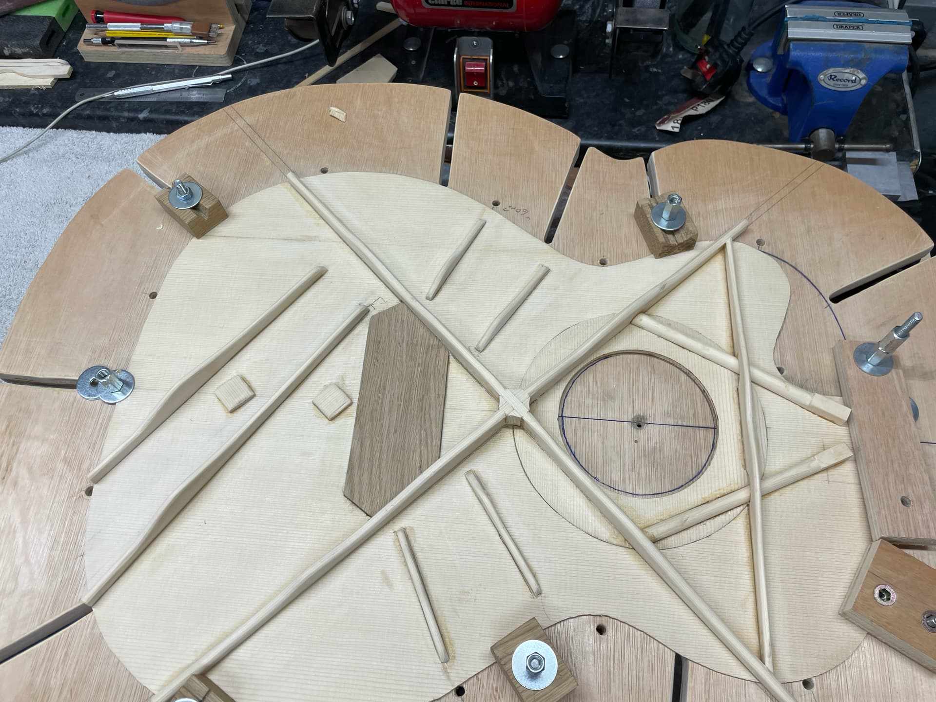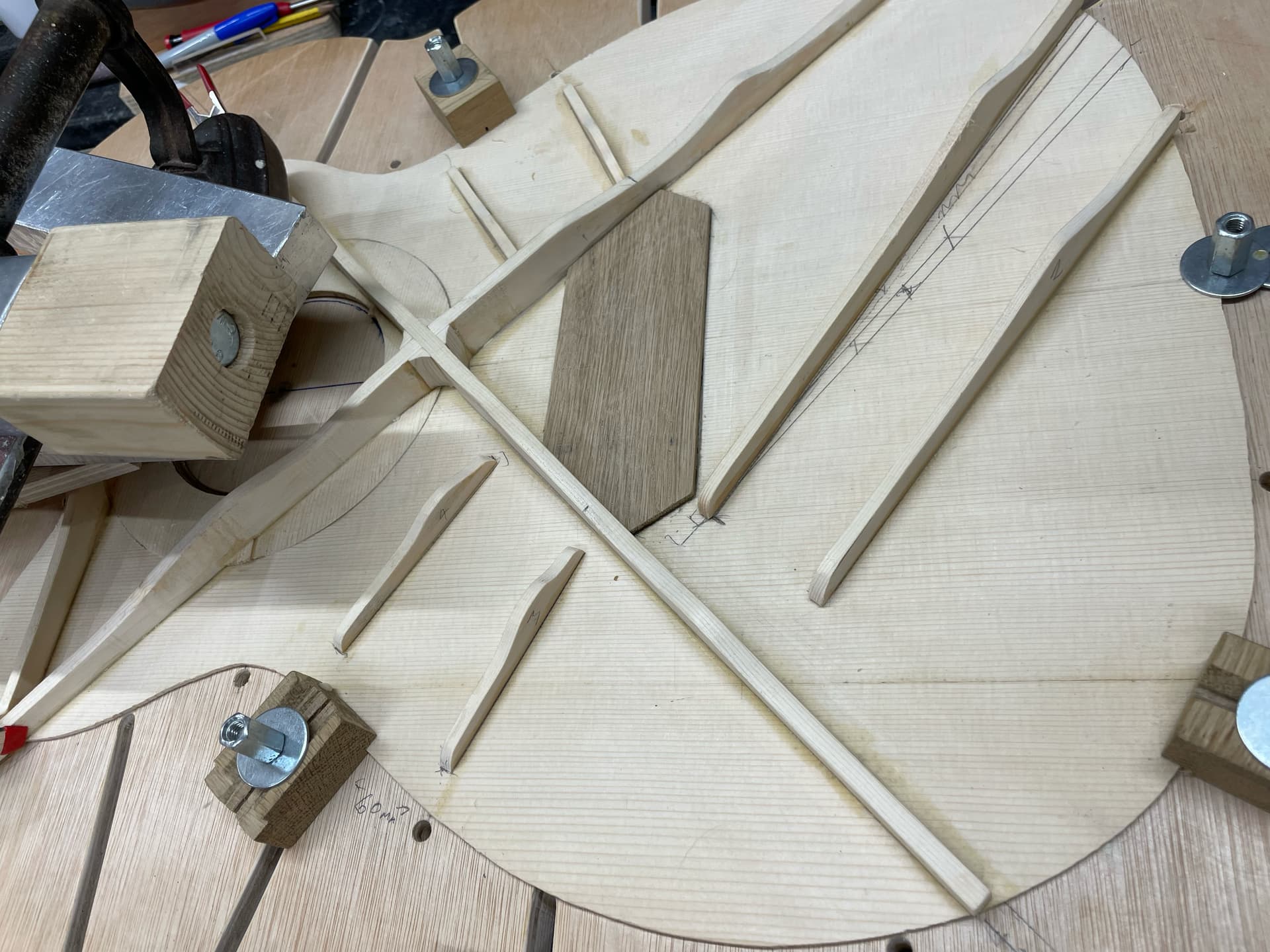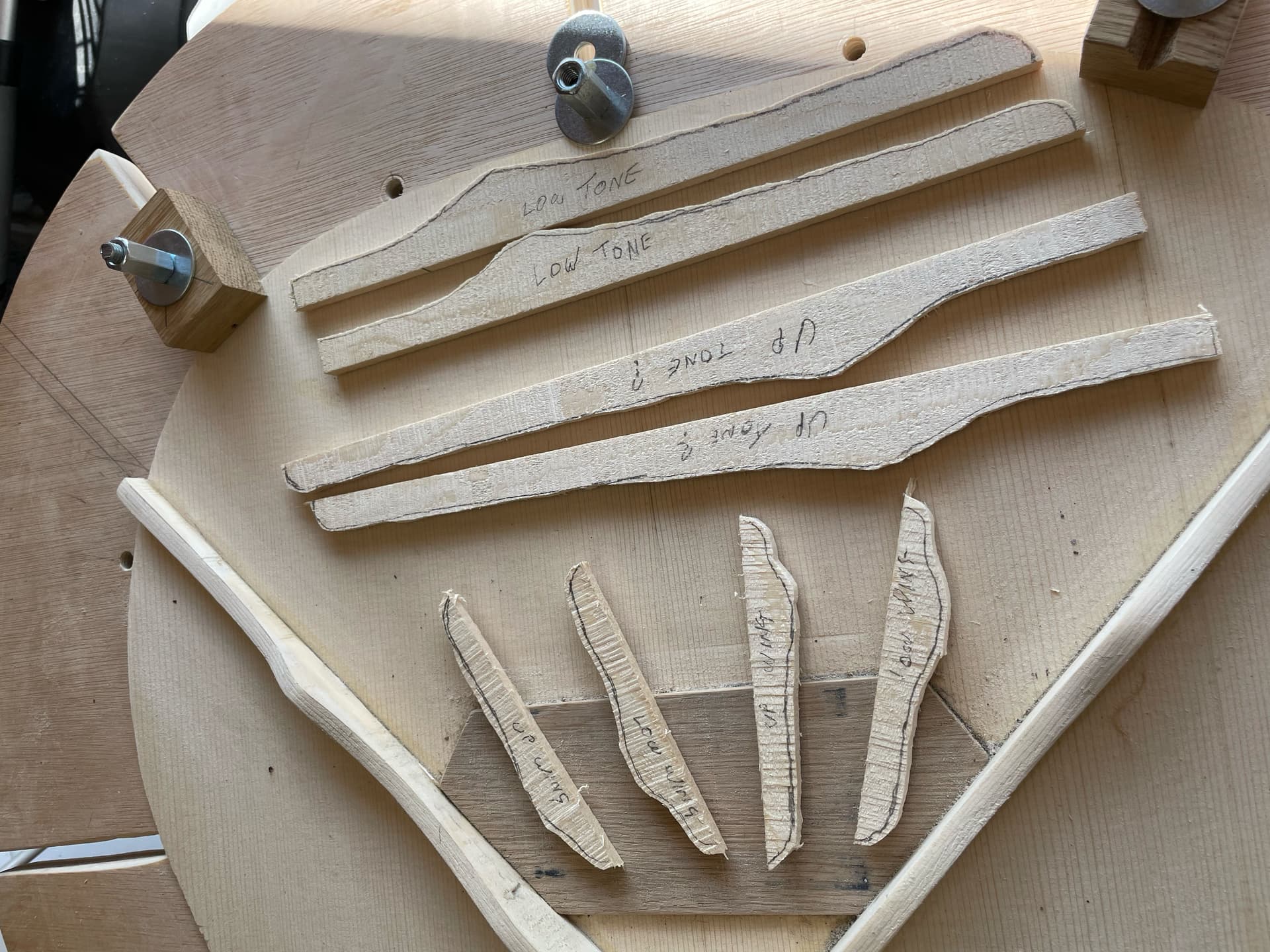 So today I took the cast iron and weights off, and to my surprise the wood was stained from the iron even though I have sandpaper on the bottom of the Iron as I use it to sand flat surfaces, not good anyway, I will have to sand it clean again. You can see from the photos how I trace the patterns onto plain paper, I then stick them to rough cut shapes, and I prepared the tone bars and strengtheners. That’s enough for today, cheers, HEC