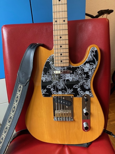 I completely sanded the neck all over (even removing the Squier logo) to remove the lacquer and made it super smooth and oiled it - much nicer than lacquer. Completely levelled and crowned and polished all the frets. Changed the pickguard for a fancy one. Put in Iron Gear Steel Foundry overwound pickups and new pots, switch and knobs. The switch is a 4 way so that I have the 2 pickups in both series and parallel. Brass saddles and new tuners (very cheap but good).